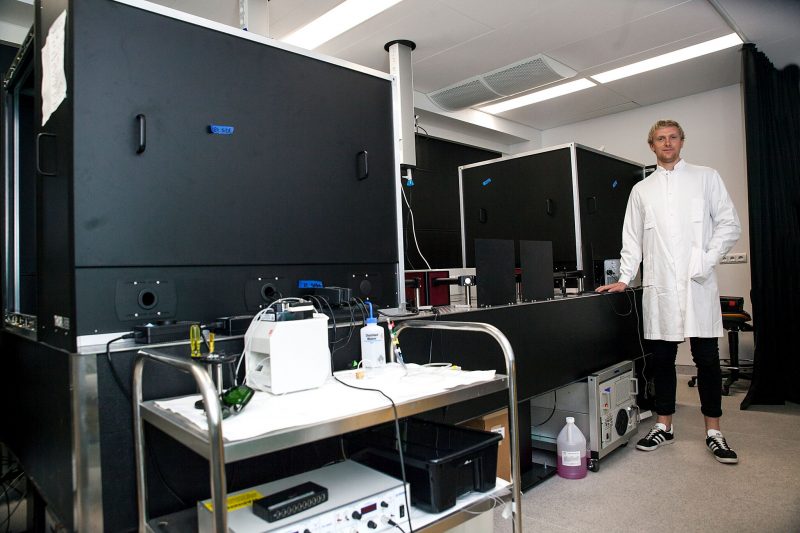 Simon Sanggaard, laboratorie ansvarlig ved Center for Basic and Translational Neuroscience, ved det Air Flow Table som ChrisAll Solution flyttede. Det 1,8 tons tunge bord udligner via automatisk styret lufttryk i benene for vibrationer. I begge sider er monteret sofistikerede mikroskoper og i midten en laser til begge enheder.