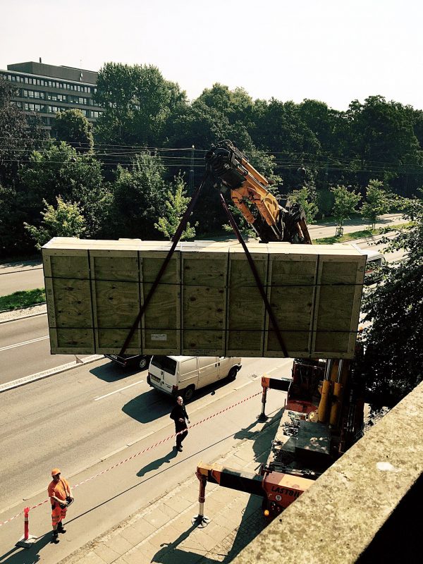 Det vibrationsfrie bord – Air Flow Table – der vejer ca 1,8 tons, bliver hejst med kran fra gadeplan til anden sal på Panum.