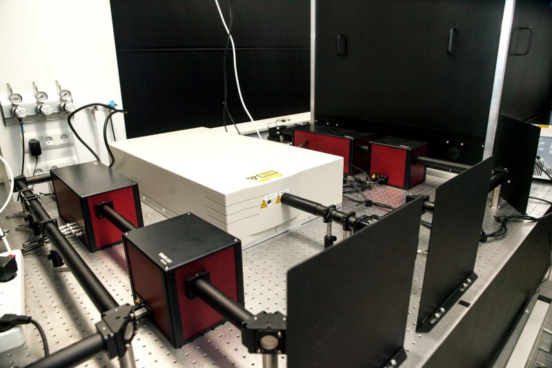 idt på det vibrationsfrie bord er monteret en laser der betjener de to 2-foton mikroskoper i begge ende af bordet.